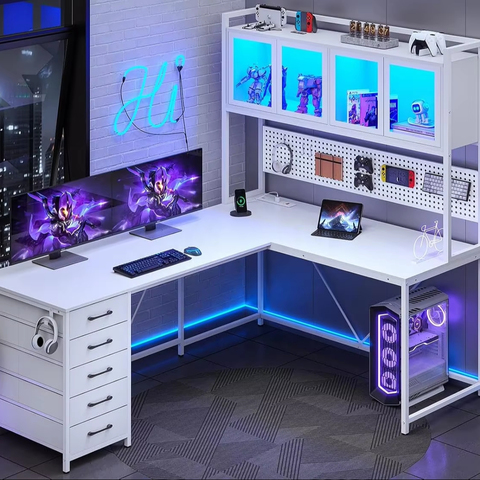 L hình chơi game bàn với ngăn kéo kệ lưu trữ Đèn Led Ổ cắm điện mộc mạc Nâu nhà văn phòng góc bàn